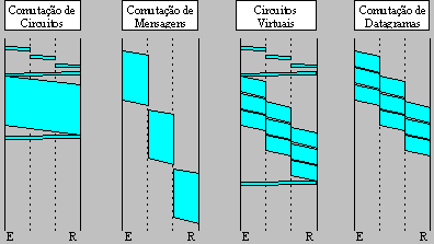 A figura seguinte ilustra o comportamento das técnicas descritas numa rede com dois nós intermédios: ![]() O caso mais divulgado de aplicação da comutação de pacotes é o protocolo X.25. As redes X.25, implementam comutação de pacotes que assenta (encapsulamento) sobre a transmissão de "tramas" na camada de ligação lógica segundo o protocolo LAP-B (idêntico ao HDLC). Na altura em que surgiram as redes X.25 a qualidade das linhas de transmissão era muito baixa e os erros de transmissão extremamente frequentes. As redes X.25 proporcionam comunicações fiáveis sobre as piores condições, para o conseguirem implementam controlo de erros independente em cada linha interna da rede. Algumas das caracteristicas das redes X.25 são: