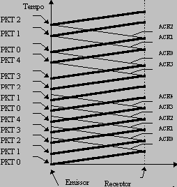 Protocolo de Janela Deslizante ("Sliding Window Protocol")A solução consiste no envio e ACK de pacotes em conjunto, o emissor começa por enviar um número de pacotes w que designaremos de "tamanho da janela". O tamanho da janela é o número de pacotes que podem ser enviados sem qualquer ACK do receptor.O tamanho de janela é conhecido tanto pelo emissor como pelo receptor, até porque este último tem de reservar inicialmente um "buffer" com capacidade para w pacotes, com "stop & wait" apenas necessitava de reservar espaço para um pacote. Para garantir o funcionamento do mecanismo, tanto os pacotes como os ACK são númerados de 0 a w. Esta númeração evita que o receptor tenha de enviar ACK individuais para todos os pacotes. Compreende-se facilmente o funcionamento sabendo que a regra base é de que o número de pacotes que podem ser enviados sem ACK do receptor é w. Por exemplo: Se o receptor envia ACK-8 quer dizer que já retirou do "buffer" todos os pacotes até PAC-8, nesta situação o emissor fica a saber que pode manter sem ACK os w pacotes depois do PAC-8. ![]() Animação em Java Script A eficiência deste método depende do facto de o ACK-0 chegar antes ou depois de o emissor enviar w pacotes (esgotar a janela). Esta questão só se põe numa linha "full-duplex", se a linha é "half-duplex", tal como na animação acima, só depois de os pacotes chegarem ao destino e a linha se encontrar livre é que o receptor pode enviar o ACK. Numa linha "half-duplex" a eficiência nunca será de 100%. Pelo contrário, numa linha "full-duplex", tal como se pode verificar no esquema seguinte, desde que o ACK-0 chegue ao emissor antes de este esgotar a janela a emissão de pacotes pode ser continua. A figura seguinte ilustra o funcionamento numa linha "full-duplex" com w=4 e uma eficiência de 100%: ![]() O tempo necessário a esgotar a janela é: w x Tt, normalizando (relativamente a Tt) será : w