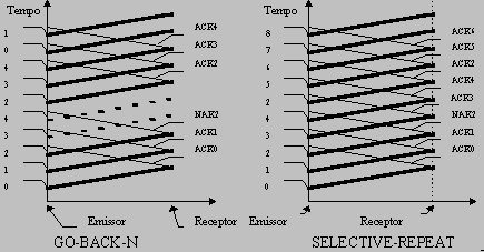 Numa implementação "go-back-any" não se levantam grandes problemas, o receptor ignora os pacotes 0 e 1, aceita os pacotes 2 a 6 e responde com ACK-6. Numa implementação "selective-repeat" tudo se complica porque os pacotes 3 a 6 foram recebidos sem erro e por isso o receptor fica disponível para aceitar o pacote 2 e os pacotes 7;0;1;2;3;4. Vai por isso aceitar correctamente o pacote 2, mas incorrectamente os pacotes 0 a 4 que vai colocar na janela seguinte, mas ainda pertencem à janela anterior. O problema é que como são aceites pacotes fora de sequência as retransmissões por "timeout" vão ser desastrosas. A solução é obrigar a que o tamanho da janela seja igual a metade da gama dos número de sequência, deste modo nunca é possivel que pacotes retransmitidos por "timeout" tenham números de sequência aceitaveis para o receptor: O "selective-repeat" é assim mais exigente quanto à largura da janela, nas implementações anteriores bastava w = 2n-1. Voltando novamente ao exemplo, para manter w=7 os números de sequencia terão de ser 0 a 13: