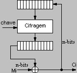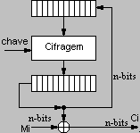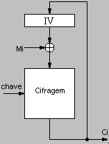 Rivest Ciphers (RC2; RC4 e RC5)Esta é uma sucessão de algorimos bastante usados na actualidade que possuem maior flexibilidade e possibilitam maior segurança do que o DES simples. Todos são algoritmos simétricos (a mesma chave é usada para cifrar e para decifrar). Rivest Cipher 2 (RC2)O RC2 caracteriza-se por blocos de entrada de 64 bits (8 bytes), contudo podem ser usadas chaves com vários tamanhos, o tamanho mais comum, por ser considerado seguro é de 128 bits (16 bytes). Rivest Cipher 4 (RC4)O RC4 não é uma técnica de blocos, trabalha em continuo com um fluxo de entrada de bytes e saída de bytes cifrados ou decifrados conforme o caso. Esta é uma técnica actualmente muito usada, por um lado porque funciona em fluxo continuo e por outro lado porque é bastante rápida (cerca de 4 vezes mais rápida do que o DES simples). Tal como o RC2 permite qualquer comprimento de chave, usando-se normalmente 16 bytes (128 bits). Rivest Cipher 5 (RC5)Esta é novamente uma técnica de cifragem em bloco, o RC5 caracteriza-se por uma grande flexibilidade e possibilidade de parâmetrização. Com o RC5 os blocos de entrada podem ter qualquer dimensão pré-determinada, a chava também pode ter qualquer comprimento, e também se pode pre-determinar o número de iterações do algoritmo. O RC5 é como se pode deduzir muito flexivel, estando sujeito a uma serie de parâmetros que devem ser ajustados às necessidades particulares de cada caso. A mensagem original é fornecida ao algoritmo sob a forma de dois blocos de w bits, correspondendo ao alinhamento mais conveniente para o sistema em causa, os valores tipicos para w são: 16, 32 e 64. A mensagem cifrada possui forma idêntica. Outro parâmetro importante é o número de aplicações do algoritmo (r), pode variar de 1 a 255. Para aplicar r vezes o algoritmo, vai ser gerada apartir da chave uma tabela com t = 2.(r+1) blocos de w bits. A chave é especificada pelos parâmetros b e k, b especifica o número de bytes (octetos) que constitui a chave e k é a chave propriamente dita. É habitual usar a notação RC5-w/r/b para especificar uma implementação particular RC5. Podemos dizer que o RC5-32/16/7 é equivalente ao DES. Os valores mais usados são RC5-32/12/16 e RC5-32/16/8. O documento "The RC5 Encryption Algorithm" contém grandes detalhes sobre o RC5, incluido uma implementação em C. International Data Encryption Algorithm (IDEA)É mais uma técnica de cifragem simétrica em bloco que é usada na actualidade. Usa blocos fixos com 64 bits (8 bytes) e usa chaves com 128 bits (16 bytes). Na actualidade é considerada segura, mas ao contrário dos algoritmos RC usa chaves de comprimento fixo que certamente vão comprometer o seu futuro. BLOWFISHÉ um algoritmo simétrico conhecido pela sua velocidade, sendo bastante mais rápido do que o RC2 e o IDEA. Usa blocos fixos com 64 bits (8 bytes), mas as chaves podem ter qualquer comprimento (128 bits é o mais corrente na actualidade). ARCFOURÉ um algoritmo considerado equivalente ao RC4, tal como o RC4 não usa blocos de entrada mas sim um fluxo contínuo de bytes e as chaves podem ter comprimento variável, novamente 128 bits é o valor mais corrente na actualidade. Aplicação das técnicas de cifragem em blocoAs técnicas de cifragem em bloco (Ex: DES, RC2, RC5, IDEA, ...) podem ser aplicadas de diversos modos a mensagens de comprimento diferente do tamanho de bloco. A técnica mais simples é conhecida por ECB ("Electronic Code Book"), consiste em dividir a mensagem em blocos de tamanho adequado, cifrar os blocos em separado e concatenar os blocos cifrados na mesma ordem. O grande inconveniente desta técnica é que blocos de mensagem original idênticos vão produzir blocos cifrados idênticos, isso pode não ser desejável. A técnica CBC ("Cipher Block Chaining") evita este inconveniente, realiza a operação xor entre o bloco a cifrar Mi e o bloco anteriormente cifrado Ci, só depois aplica o algoritmo de cifragem: Ci = cifragem( chave, Mi xor C(i-1)) ![]() Na decifragem obtém-se Mi xor C(i-1), como xor-1 = xor, utiliza-se: Mi = decifragem( chave, Ci) xor C(i-1) Como para o primeiro bloco não existe mensagem anterior, utiliza-se um bloco aleatório conhecido por IV ("Initialization Vector"). Esta técnica é pouco favorável sob o ponto de vista da propagação de erros, uma vez que um erro na transmissão de um bloco cifrado Ci vai inutilizar tanto o bloco Mi como o seguinte M(i+1). Nas técnicas CFB ("Cipher FeedBack") e OFB ("Output FeedBack") a mensagem não é directamente cifrada, existe um vector de inicial (IV) ao qual é aplicado o algoritmo de cifragem, aplica-se então a operação xor entre o vector cifrado e a mensagem. A operação xor entre o vector cifrado e a mensagem é realizada do seguinte modo: