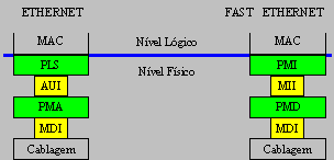 "Fast Ethernet" (100baseT)A utilização de taxas de 100 Mbit/s (vulgarmente conhecida por “Fast Ethernet”) obrigou a modificações apenas no nível físico. O MAC e LLC mantêm-se, o que permite uma total compatibilidade com as versões a 10 Mbit/s. Existem duas implementações bastante diferentes para o "fast ethernet":